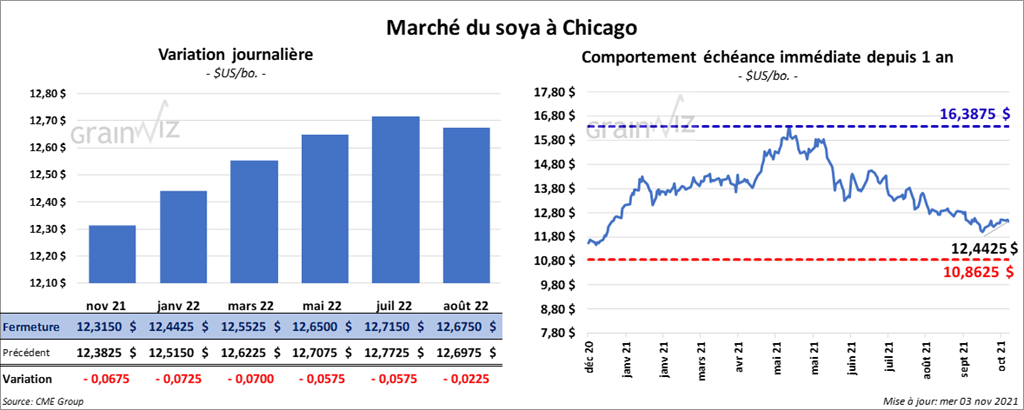Les contrats de soya US aux échéances les plus rapprochées ont fini la journée en recul entre 6 ¾ et 7 ¼ cents. Ceux de tourteau de soya US US aux échéances les plus rapprochées ont fait l’inverse en fermant en hausse entre 1,50 et 3,60 $/tonne. Les contrats d’huile de soya US aux échéances les plus rapprochées ont terminé dans le rouge entre 93 et 96 points.