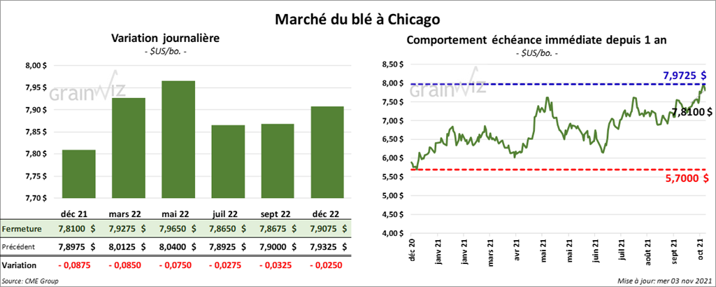 À Chicago, les contrats de blé aux échéances les plus rapprochées ont fini la séance en recul entre 7 ½ et 8 ¾ cents. À Kansas, ceux de blé dur rouge aux échéances les plus rapprochées ont aussi clôturé en baisse entre 7 ½ et 7 ¾ cents. À Minneapolis, les contrats de blé de printemps aux échéances les plus rapprochées ont terminé la session avec des pertes entre 26 ¼ et 31 ½ cents.