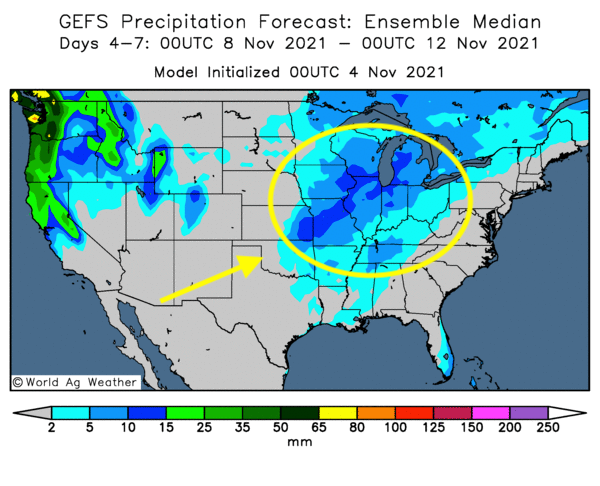 - Selon la NOAA, aujourd’hui, les températures dans le centre des États-Unis devaient se situer entre 10 et 15,6 degrés Celsius. D’ici jusqu’à samedi, elle prévoyait un ciel dégagé pour le centre des États-Unis. La World Weather prévoit de son côté un ciel dégagé pour le centre des États-Unis entre la journée d’aujourd’hui et dimanche. À plus long terme, pour les 4 à 7 prochains jours, elle prévoit des averses à l’ensemble du Corn Belt, surtout au centre.