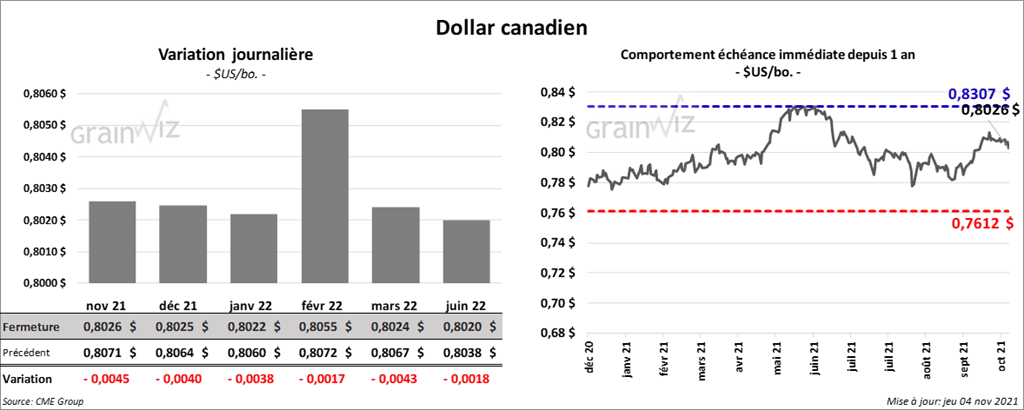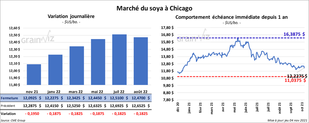 Les contrats de soya US aux échéances les plus rapprochées ont clôturé en recul entre 18 ¼ et 19 ½ cents. Ceux de tourteaux de soya US aux échéances les plus rapprochées ont fermé en baisse entre 3,90 et 5,00 $/tonne. Les contrats d’huile de soya US aux échéances les plus rapprochées ont fini la session avec des pertes entre 125 et 145 points.