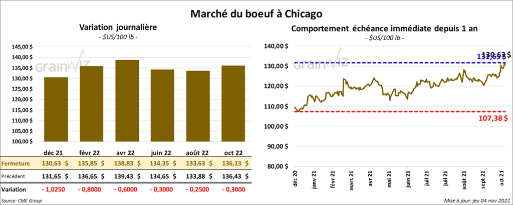 - Le 3 novembre dernier, le CME Feeder Cattle Index était en hausse de 16 cents à 155,81 $.