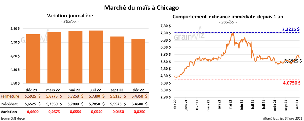 Les contrats de maïs US aux échéances les plus rapprochées ont terminé la journée en baisse entre 5 ½ et 6 cents.