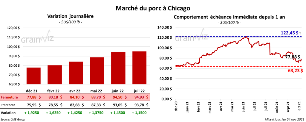 - Le 2 novembre dernier, le CME Lean Hog Index était en baisse de 34 cents à 78,70 $.