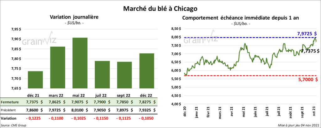 - Au cours de la semaine du 28 octobre dernier, les ventes à l’exportation de blé US ont été de 400,100 tonnes, ce qui était une augmentation de 49 % comparativement à la semaine précédente et une hausse de 4 % par rapport à la moyenne des 4 dernières semaines. Le Mexique et la Corée du Sud ont été les principaux acheteurs. Les prévisions des analystes étaient entre 180,000 et 500,000 tonnes.