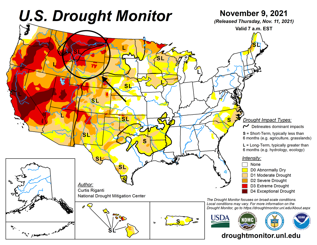 - Un système de tempêtes hivernales devait se déplacer dans le Midwest et le nord des Plaines US aujourd’hui en entrainant dans ces régions de la pluie, de la neige et de forts vents. Par conséquent, les activités de récolte, d’application de fertilisants et celles d’ensemencement de blé d’hiver US pouvaient être ralenties dans ces secteurs. À noter aussi que le sud et l’est des États-Unis n’étaient pas en reste puisqu’ils devaient également rencontrer de forts vents accompagnés de pluies. Toutefois, les données météo indiquent que les Plaines US n’ont pas reçu suffisamment de pluies pour réduire le stress hydrique qui pourrait affecter le blé dur rouge d’hiver récemment semé dans la région. Quelques averses dans le centre et le sud des Plaines US sont attendues prochainement, ce qui pourrait aider à réduire les effets de la sécheresse. Comme le montre la carte, les conditions demeurent extrêmement sèches pour le nord des Plaines US.