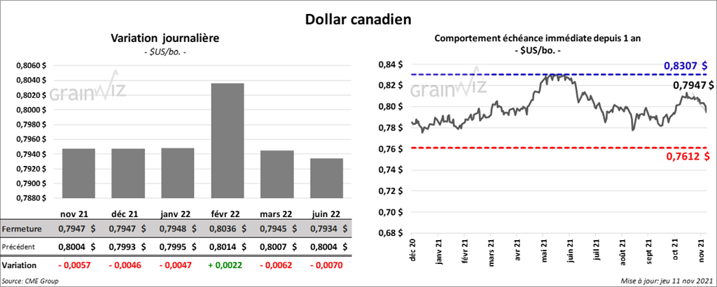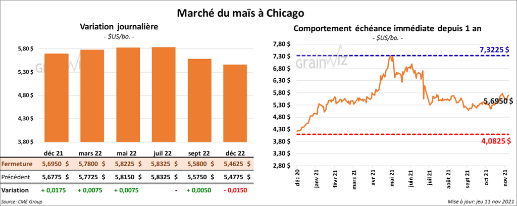 - Le rapport hebdomadaire des ventes à l’exportation sera présenté demain en raison du congé du Veterans Day. Dans le cas du maïs US, les analystes s’attendent à des ventes à l’exportation entre 700,000 et 1,4 million de tonnes.
