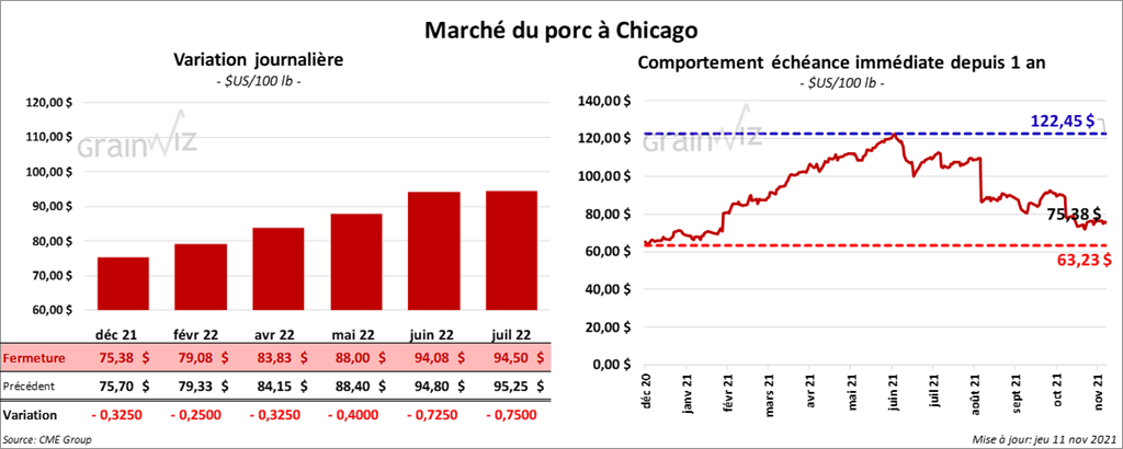 - Le 9 novembre dernier, le CME Lean Hog Index a été en baisse de 51 cents à 78,72 $.