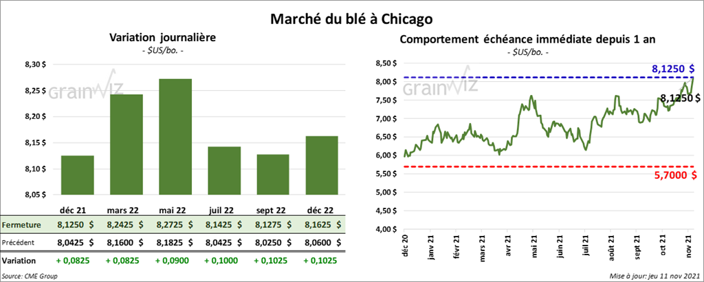 À Chicago, les contrats de blé aux échéances les plus rapprochées ont fermé en hausse entre 8 ¼ et 9 cents. À Kansas, ceux de blé dur rouge aux échéances les plus rapprochées ont clôturé dans le vert entre 8 ¼ et 10 ½ cents. À Minneapolis, les contrats de blé de printemps aux échéances les plus rapprochées ont fini en progression entre 7 et 10 ¼ cents.