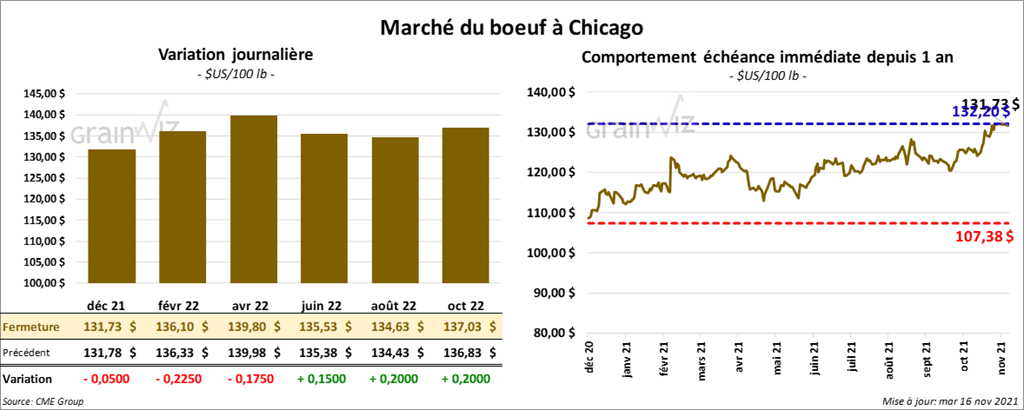 Les contrats de bœuf US aux échéances les plus rapprochées ont terminé la séance en baisse entre 5 et 22 cents. Ceux de veau US aux échéances les plus rapprochées ont fini la journée en hausse entre 80 cents et 1,02 $. Celui novembre 21 a fait exception en clôturant en baisse de 27 cents.