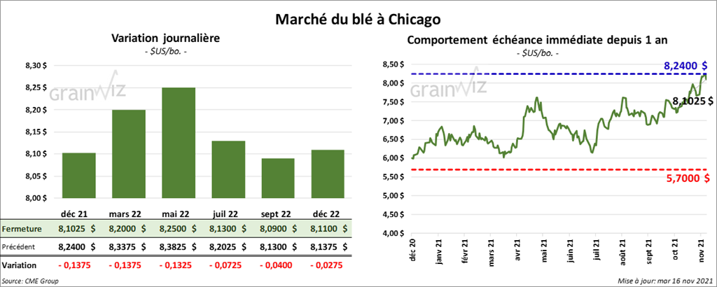 À Chicago, les contrats de blé aux échéances les plus rapprochées ont fini la session en baisse entre 13 ¼ et 13 ¾ cents. À Kansas, ceux de blé dur rouge aux échéances les plus rapprochées ont également clôturé avec des pertes entre 15 et 15 ¾ cents. À Minneapolis, les contrats de blé de printemps aux échéances les plus rapprochées ont fermé en recul entre 11 ½ et 13 ¼ cents.