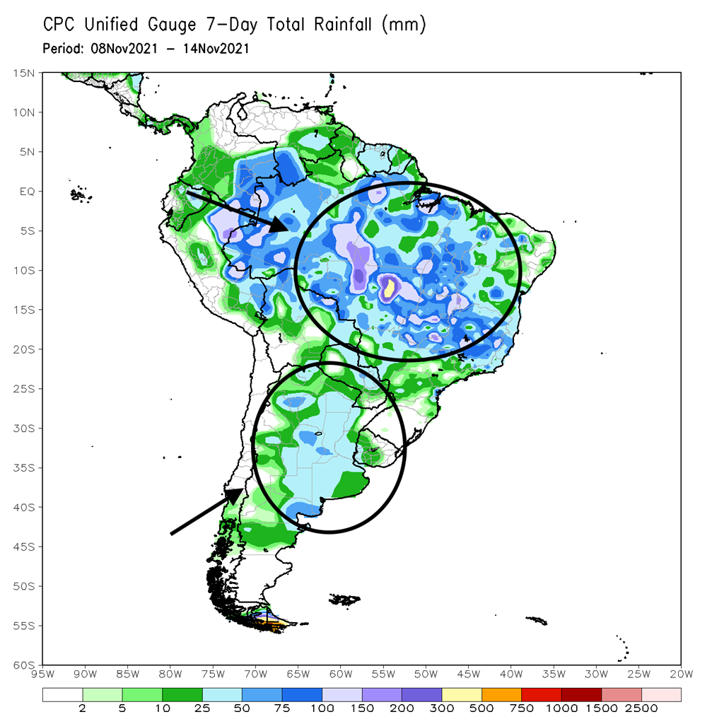 - Les conditions météo en Amérique du Sud semblent favorables aux ensemencements et au développement des cultures de maïs et de soya argentin et brésilien. Toutefois, la météo est plus encourageante pour le Brésil qu’elle ne l’est pour l’Argentine. En fait, World Weather prévoit des averses suffisantes pour les 10 prochains jours pour le Brésil et l’Argentine. Ces précipitations nécessaires devraient encourager les travaux sur le terrain, spécialement en ce qui concerne les ensemencements de cultures d’été de maïs et de soya, qui nécessitent une bonne humidité du sol. À noter que les producteurs argentins redoutent toujours un temps sec à plus ou moins long terme, une situation qui pourrait entraver le développement des plants de maïs et de soya. Cette carte de l’Amérique du Sud (NOAA) montre les prévisions de précipitations pour le Brésil et l’Argentine pour les 7 prochains jours.