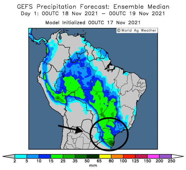 - Le NOAA prévoit suffisamment d’averses pour les zones de production de maïs et de soya de l’Argentine et du Brésil pour les 7 prochains jours, ce qui devrait encourager les activités aux champs tout comme le développement des cultures de maïs et de soya des 2 pays. À noter toutefois que les conditions météo sont actuellement plus sèches dans le sud du Brésil qu’elles ne le sont au centre et au nord du pays. Malgré tout, la situation ne semble pas critique à court terme puisque, selon World Weather, des averses, qui arrivent justes à temps, étaient prévues aujourd’hui pour le sud du Brésil. Le système pourrait même s’attarder dans la région jusqu’à vendredi. Les conditions météo favorables en Argentine et au Brésil exercent donc une pression négative sur les prix du maïs et du soya à l’échelle mondiale. Néanmoins, le développement de La Nina, qui pourrait entrainer de la chaleur et des conditions plus sèches que la normale en Amérique du Sud, reste à surveiller à plus ou moins long terme. Ce phénomène météo pourrait occasionner des problèmes de développement pour les cultures de maïs et de soya, surtout en Argentine. Cette carte montre les précipitations prévues demain pour le sud du Brésil.