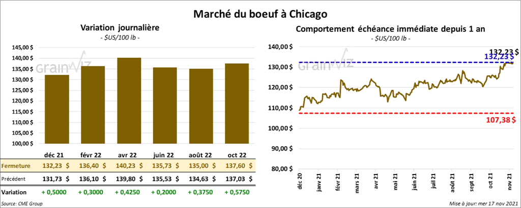 - Le 16 novembre dernier, le CME Feeder Cattle Index était en baisse de 1 cent à 155,48 $.