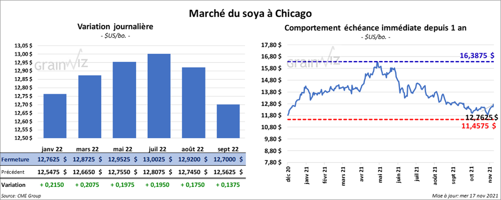 - L’USDA a rapporté des ventes privées à l’exportation de 132,000 tonnes de soya US pour des livraisons en 2021/22. La Chine est la destination.