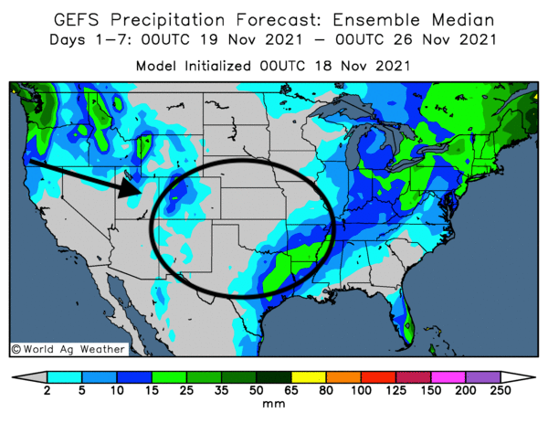 - Ailleurs, dans le centre et ai sud des États-Unis, World Weather mentionne que les conditions demeureront probablement sèches au moins jusqu’à dimanche, ce qui pourrait occasionner un stress hydrique pour les plants de blé d’hiver US nouvellement semés dans ces régions. Par la suite, World Weather montre que des averses sont prévues dans une période des 7 prochains jours, mais elles seront probablement concentrées dans le sud-est des États-Unis. Une bonne partie des zones de production de l’Oklahoma et du Kansas situées plus à l’ouest pourrait ne pas recevoir d’averses au cours de cette période. Cette carte de World Weather montre le manque de précipitation pour le centre et le sud des États-Unis au cours des 7 prochains jours.