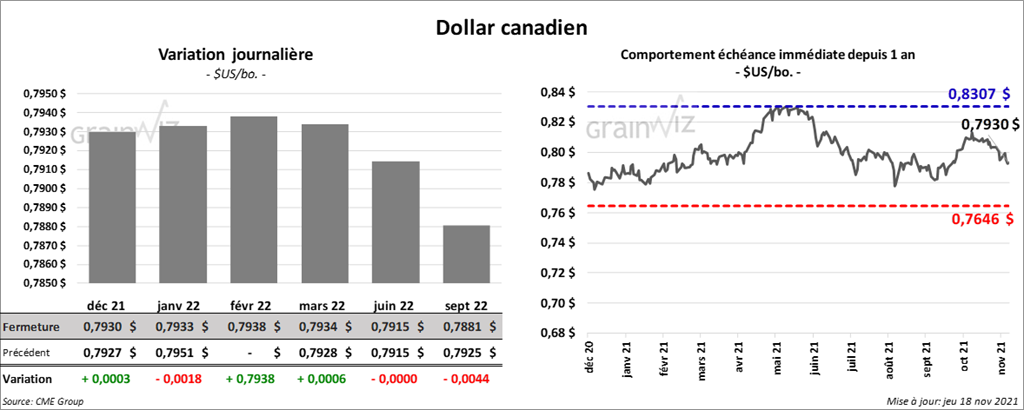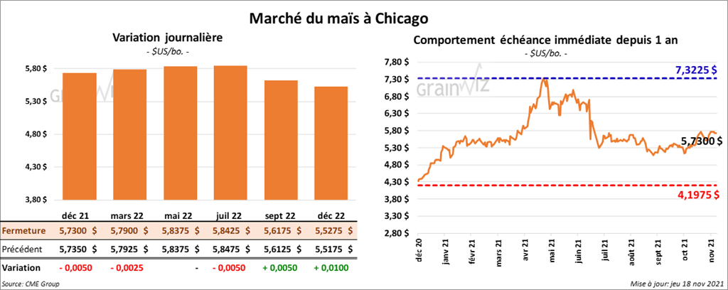 - Durant la semaine du 11 novembre dernier, les ventes à l’exportation de maïs US ont été de 904,600 tonnes, ce qui était une baisse de 15 % comparativement à la semaine précédente et une réduction de 19 % par rapport à la moyenne des 4 dernières semaines. Le Canada et le Mexique ont été les principaux acheteurs. Les projections des analystes étaient entre 800,000 et 1,4 million de tonnes.