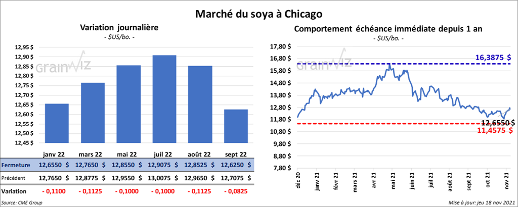 Les contrats de soya US aux échéances les plus rapprochées ont terminé en baisse entre 10 et 11 ¼ cents. Ceux de tourteau de soya US aux échéances les plus rapprochées ont également fini dans le rouge entre 4,30 et 5,10 $/tonne. Les contrats d’huile de soya US aux échéances les plus rapprochées ont fermé entre une baisse de 6 points et une hausse de 2 points.