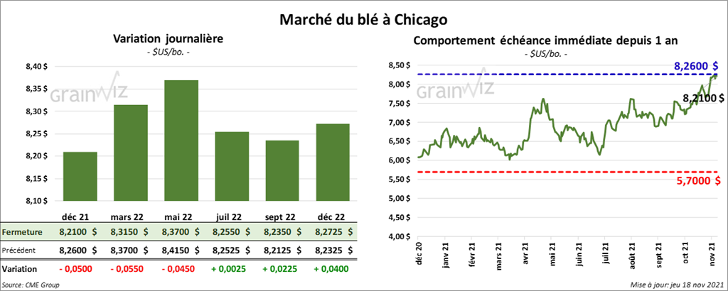 - Durant la semaine du 11 novembre dernier, les ventes à l’exportation de blé US ont été de 399,100 tonnes, ce qui était une augmentation de 40 % comparativement à la semaine précédente et une hausse de 21 % par rapport à la moyenne des 4 dernières semaines. Le Nigeria et le Vietnam ont été les principaux acheteurs. Les projections des analystes étaient entre 250,000 et 500,000 tonnes.