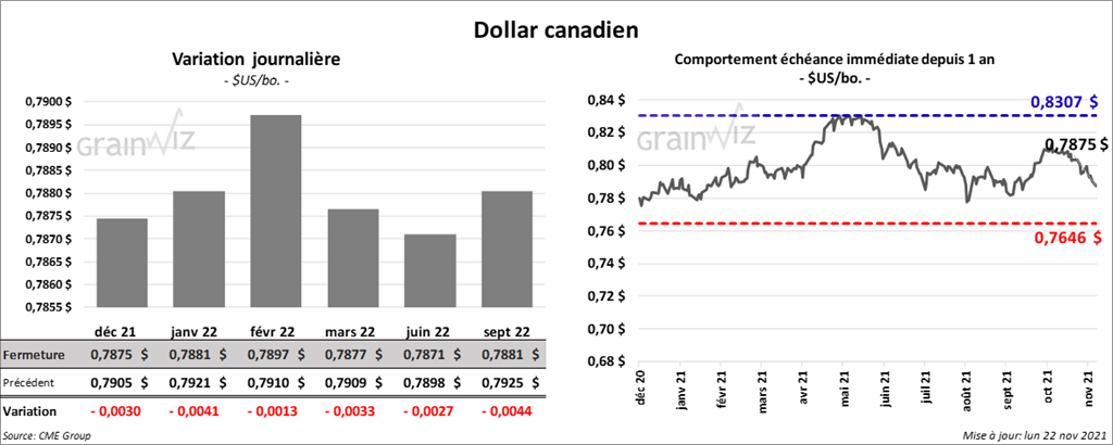- Le rapport sur la progression des cultures indique qu’au 21 novembre dernier, les ensemencements de blé d’hiver US étaient terminés à 96 % comparativement à 98 % l’an dernier et 97 % pour la moyenne quinquennale. De plus, 86 % des plants avaient émergé contre 88 % l’an passé et 87 % pour la moyenne des 5 dernières années. Par contre, les conditions de cultures ont baissé de 2 % à 44 % dans les catégories «bon à excellent».