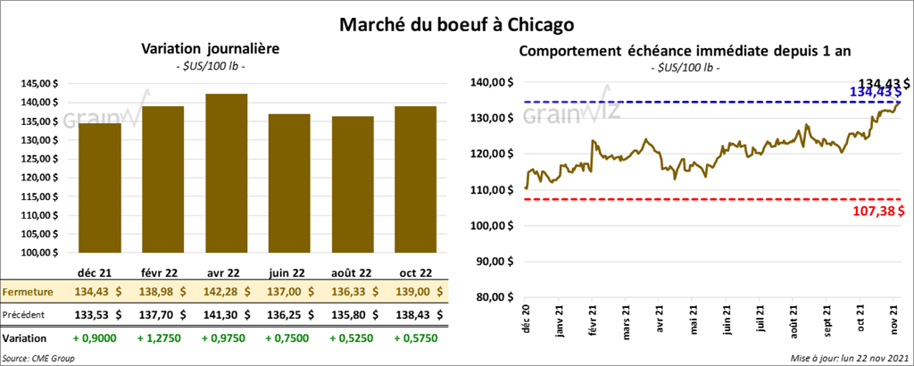 - Le 19 novembre dernier, le CME Feeder Cattle Index était en hausse de 64 cents à 156,29 $.