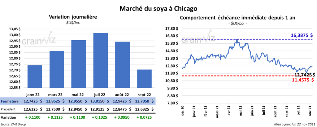 Les contrats de soya US aux échéances les plus rapprochées ont fini la séance en hausse entre 11 et 11 ¼ cents. Ceux de tourteau de soya US aux échéances les plus rapprochées ont clôturé dans le rouge entre 30 cents et 1,80 $/tonne. Les contrats d’huile de soya US aux échéances les plus rapprochées ont fermé en progression entre 125 et 129 $.