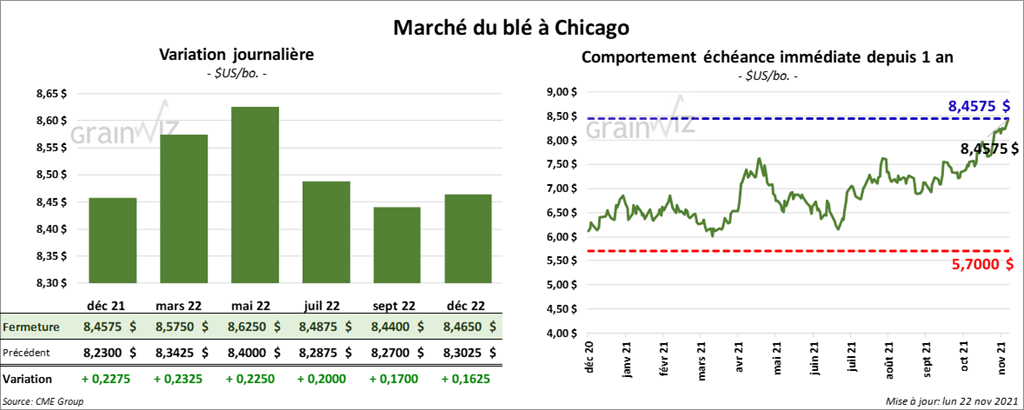 À Chicago, les contrats de blé US aux échéances les plus rapprochées ont terminé la session en hausse entre 22 ½ et 23 ¼ cents. À Kansas, ceux de blé dur rouge aux échéances les plus rapprochées ont fini en progression entre 26 ¾ et 28 cents. À Minneapolis, les contrats de blé de printemps ont clôturé dans le vert entre 13 ¼ et 18 ¾ cents.