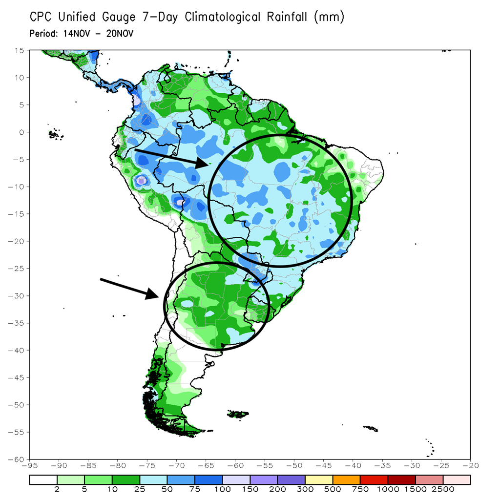 - À court terme, World Weather estime que les conditions de cultures au Brésil sont favorables pour le développement des cultures de soya et de maïs. D’ailleurs, AgRural estime que 86 % des plants de soya ont été semés dans de bonnes conditions. Pour l’Argentine, World Weather prévoit des averses à court terme pour le nord et le centre du pays. Mais, le sud devrait tout de même demeurer sec. Selon le NOAA, au cours de la période des 7 jours, des averses sont attendues pour le nord, le centre et l’ouest du Brésil. Le nord et le centre de l’Argentine devraient également recevoir des averses. Le sud du pays pourrait rester sec. Cette carte de l’Amérique du Sud montre les précipitations prévues au cours des 7 prochains jours.