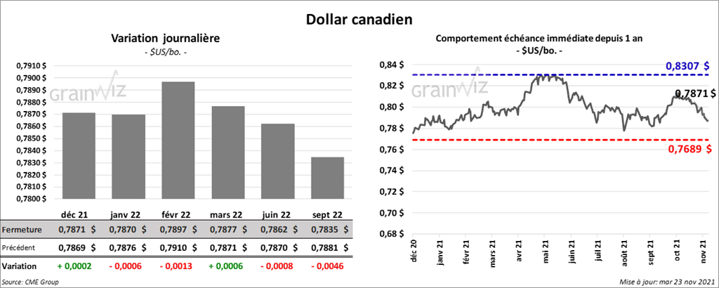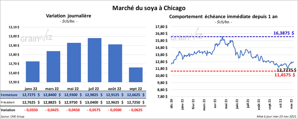 Les contrats de soya US aux échéances les plus rapprochées ont clôturé dans le rouge entre 3 ½ et 4 ½ cents. Ceux de tourteau de soya US aux échéances les plus rapprochées ont également fini avec des pertes entre 7,20 et 7,80 $/tonne. Les contrats d’huile de soya US aux échéances les plus rapprochées ont fait l’inverse en fermant en hausse de 73 points.