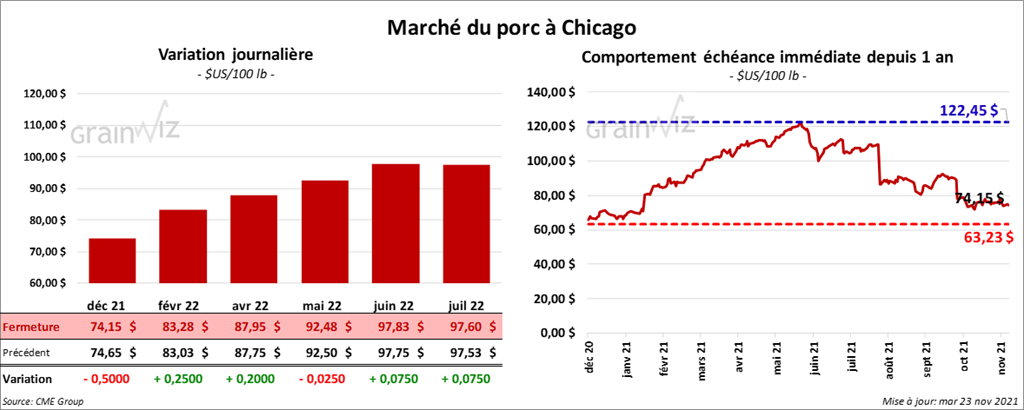 Les contrats de porc US aux échéances les plus rapprochées ont fini la journée en hausse entre 20 et 25 cents. Celui décembre 21 a fait exception en clôturant en baisse de 50 cents.