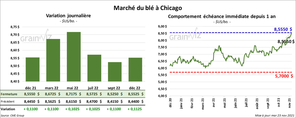 À Chicago, les contrats de blé aux échéances les plus rapprochées ont fini la journée en progression entre 10 ¼ et 11 cents. À Kansas, ceux de blé dur rouge aux échéances les plus rapprochées ont également clôturé en hausse entre 17 et 17 ½ cents. À Minneapolis, les contrats de blé de printemps aux échéances les plus rapprochées ont terminé la session avec des gains entre 13 ¾ et 14 ¾ cents.