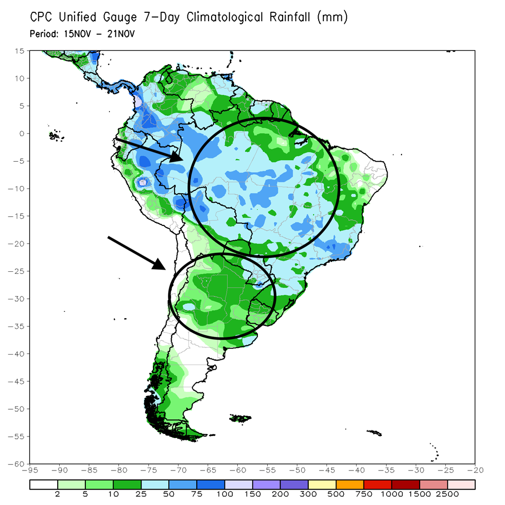 - Le phénomène météo La Nina est toujours à surveiller. À long terme, au cours des prochains mois, il est possible que les conditions soient plus chaudes et plus sèches que la normale pour l’Argentine et le sud du Brésil, ce qui suscite déjà des inquiétudes concernant le développement futur des cultures de maïs et de soya de ces régions. Cette carte de l’Amérique du Sud des 7 prochains jours fourni par le NOAA montre la différence des précipitations entre le Brésil et l’Argentine.