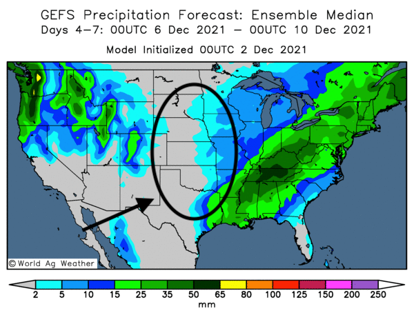 - World Ag Weather ne prévoit pas de précipitation pour le centre et le sud US avant le 5 décembre prochain et encore, les averses ne devraient affecter que l’est de l’Oklahoma et l’est du Texas. À plus long terme, entre le 6 et le 10 décembre prochains des précipitations légères sont attendues dans l’extrême est des Plaines US. Par conséquent, à l’ouest, au centre, et dans une partie du sud des Plaines US, les plants de blé d’hiver devraient continuer de subir les effets de la sécheresse avant leur période de dormance. À noter qu’au 30 novembre dernier, 52 % des plants blé d’hiver US se trouvaient dans des régions asséchées. Cette carte du centre et du sud des Plaines US, fournie par World Ag Weather, montre les précipitations prévues entre le 6 et le 10 décembre prochains.