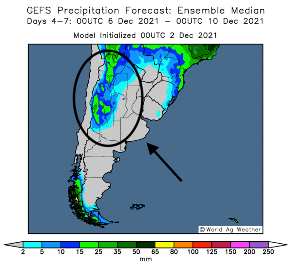 - Pour l’Argentine, World Ag Weather prévoit des averses légères à court terme à l’ensemble du pays. En outre, des pluies significatives sont prévues entre le 6 et le 10 décembre prochains et elles devraient être concentrées dans l’ouest du pays. Par conséquent, les conditions devraient être correctes à court et à long terme. Toutefois, le développement de La Nina, qui pourrait entrainer un temps plus chaud et plus sec que la normale, restera à surveiller au cours des prochains mois. À terme, le développement des cultures de maïs et de soya argentins pourrait être affecté par la chaleur et la sécheresse. Cette carte de l’Argentine, fournie par World Ag Weather, montre les précipitations prévues pour l’ouest de l’Argentine entre le 6 et le 10 décembre prochain.