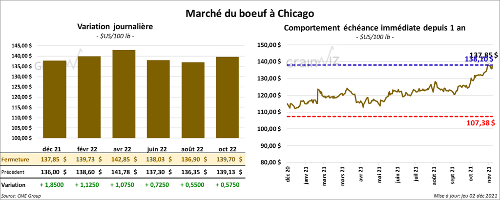 Les contrats de bœuf US aux échéances les plus rapprochées ont terminé la journée en en hausse entre 1,07 et 1,85 $. Ceux de veau US aux échéances les plus rapprochées ont clôturé en hausse entre 42 et 45 cents. Celui janvier 22 a fait exception en fermant en baisse de 5 cents.
