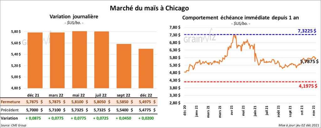 - Au cours de la semaine du 25 novembre dernier, les ventes à l’exportation de maïs US 2021/22 ont été de 1,020,800 tonnes, ce qui était une baisse de 29 % comparativement à la semaine précédente et une réduction de 12 % par rapport à la moyenne des 4 dernières semaines. Le Mexique et le Canada ont été les principaux acheteurs. Pour 2022/23, les ventes ont été de 300 tonnes et le Costa Rica était l’acheteur. Les attentes des analystes étaient entre 600,000 et 1,3 million de tonnes.