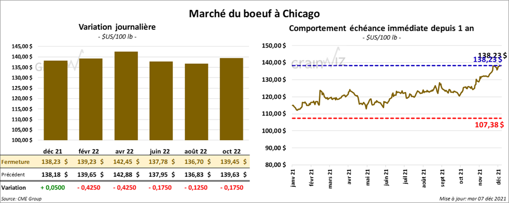 Les contrats de bœuf US aux échéances les plus rapprochées ont fermé en baisse de 42 cents. Celui décembre 21 a fait exception en terminant en hausse par 5 cents. Les contrats de veau US a aux échéances les plus rapprochées ont fini en recul entre 22 et 52 cents.
