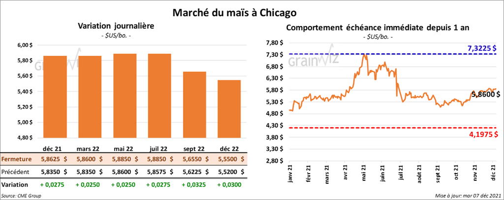 Les contrats de maïs US aux échéances les plus rapprochées ont fini la journée en hausse entre 2 ½ et 2 ¾ cents.