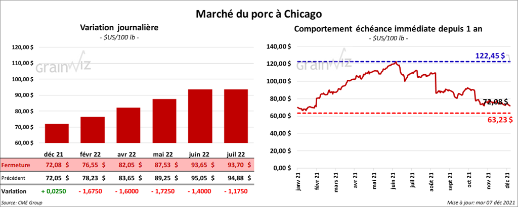 Les contrats de porc US aux échéances les plus rapprochées ont terminé la journée en baisse entre 1,60 et 1,67 $. Celui décembre 21 a fait exception en finissant en hausse de 2 cents.