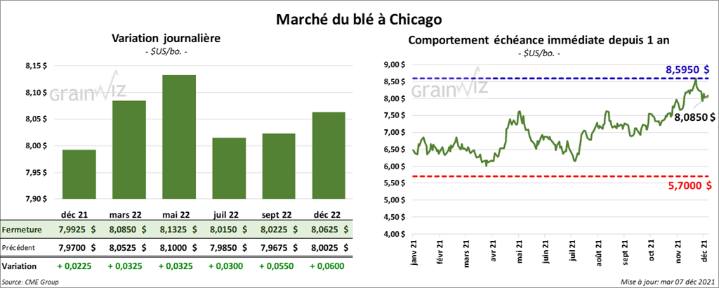 À Chicago, les contrats de blé US aux échéances les plus rapprochées ont fini la session en hausse entre 3 et 3 ¼ cents. À Kansas, ceux de blé dur rouge aux échéances les plus rapprochées ont terminé en progression entre 3 ¼ et 5 cents. À Minneapolis, les contrats de blé de printemps aux échéances les plus rapprochées ont clôturé avec des gains entre 5 ½ et 8 ¾ cents.