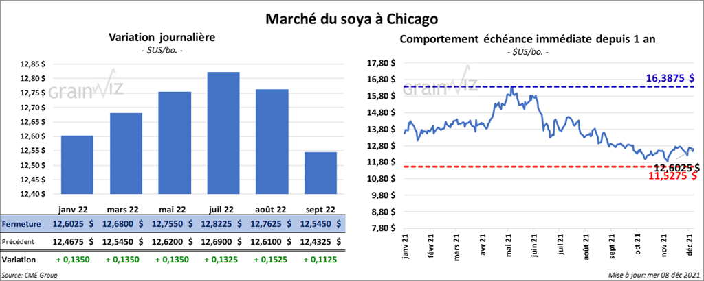 - L’USDA a annoncé des ventes privées à l’exportation de 130,000 tonnes de soya US pour des livraisons en 2021/22. La Chine est la destination.