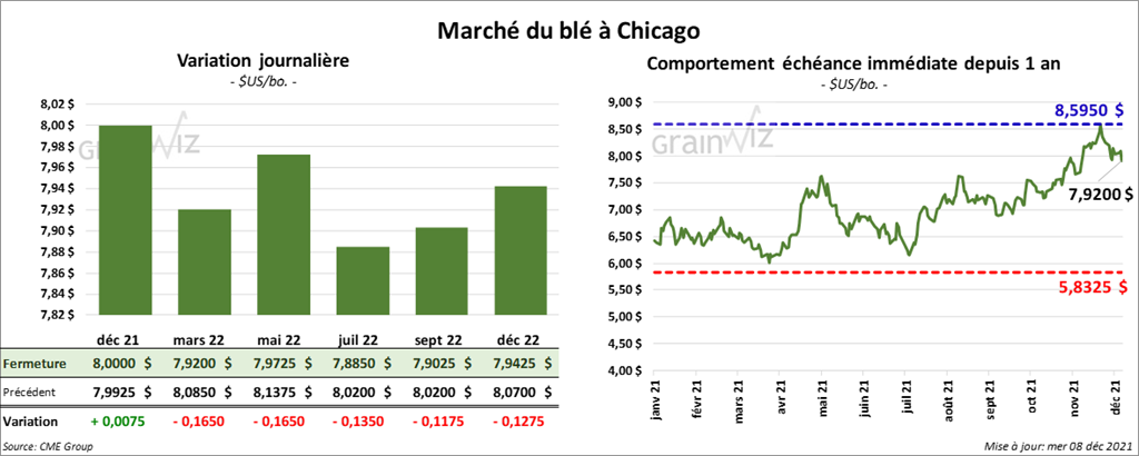 À Chicago, les contrats de blé aux échéances les plus rapprochées ont clôturé en baisse entre 13 ½ et 16 ½ cents. À Kansas, ceux de blé dur rouge aux échéances les plus rapprochées ont également fini avec des pertes entre 11 ¼ et 15 cents. À Minneapolis, les contrats de blé de printemps aux échéances les plus rapprochées ont fermé en hausse entre ¼ et ¾ cent. Celui juillet 22 a fait exception en terminant en recul de 7 ¾ cents.
