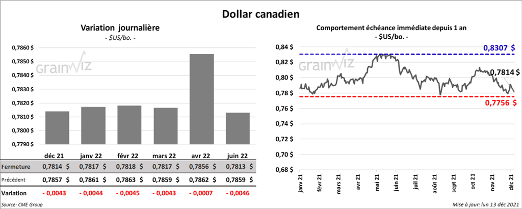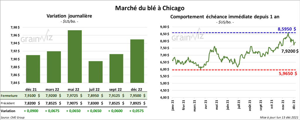 À Chicago, les contrats de blé aux échéances les plus rapprochées ont fini avec des gains entre 6 ½ et 6 ¾ cents. À Kansas, ceux de blé dur rouge aux échéances les plus rapprochées ont clôturé en hausse entre 5 et 7 cents. À Minneapolis, les contrats de blé de printemps aux échéances les plus rapprochées ont fait l’inverse en terminant en baisse entre 3 ¼ et 5 ¾ cents. Celui juillet 22 a fait exception en fermant en progression de ¾ cent.