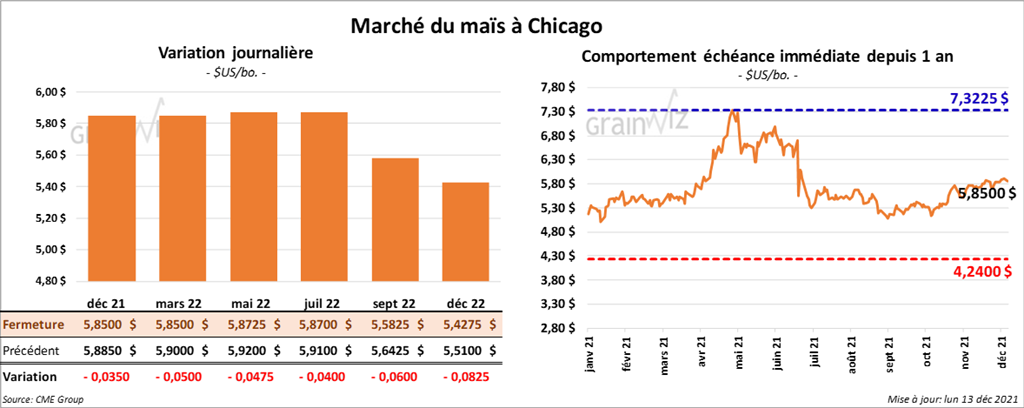 Les contrats de maïs US aux échéances les plus rapprochées ont terminé la journée en baisse entre 4 et 5 cents.