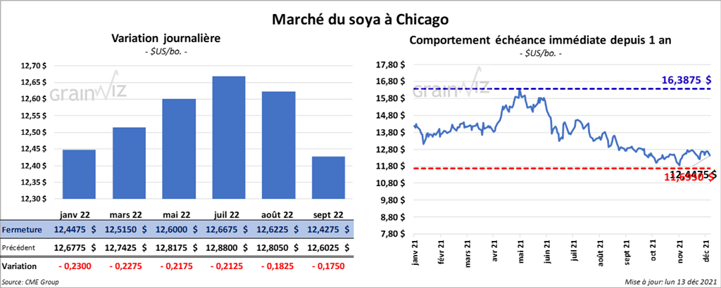 Les contrats de soya US aux échéances les plus rapprochées ont clôturé en recul entre 21 ¾ et 23 cents. Ceux de tourteau de soya US aux échéances les plus rapprochées ont également fini dans le rouge entre 4,70 et 5,70 $/tonne. Les contrats d’huile de soya US aux échéances les plus rapprochées ont fermé avec des pertes en 34 et 38 points.