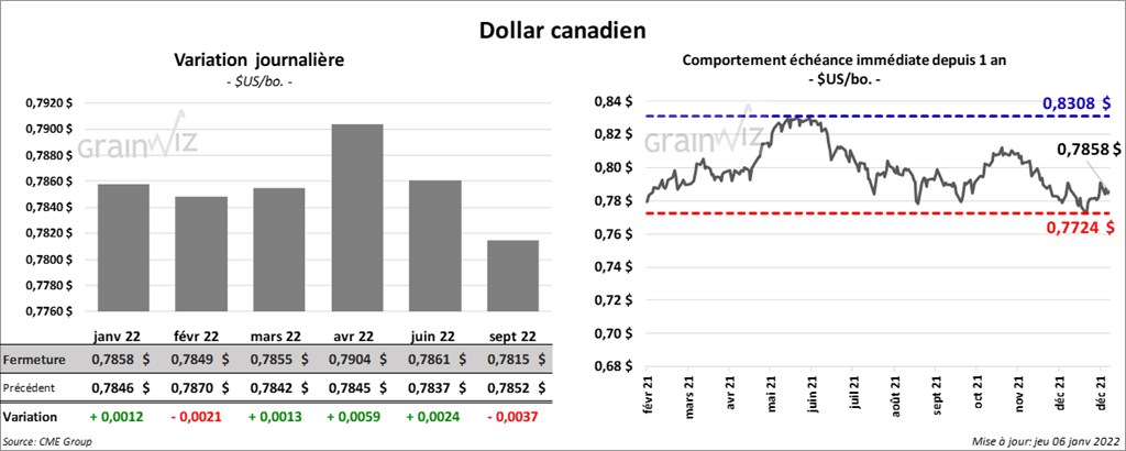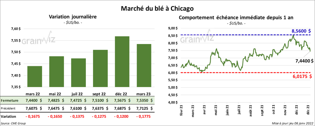 - Durant la semaine du 30 décembre dernier, les ventes à l’exportation de blé US 2021/22 ont été de 48,600 tonnes, soit un creux de l’année commerciale, une baisse de 76 % par rapport à la semaine précédente et une réduction de 87 % comparativement à la moyenne des 4 dernières semaines. L’Italie et les destinations inconnues ont été les principaux acheteurs. Les projections des analystes étaient entre 150,000 et 400,000 tonnes. Pour 2022/23, les ventes à l’exportation de blé US ont été de 2,500 tonnes. Le Pérou était l’acheteur.