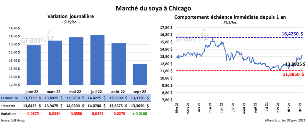 Les contrats de soya US aux échéances les plus rapprochées ont fini la session en baisse entre 4 ¾ et 5 ½ cents. Ceux de tourteau de soya US aux échéances les plus rapprochées ont également clôturé dans le rouge entre 2,30 et 3,10 $/tonne. Les contrats d’huile de soya US aux échéances les plus rapprochées ont fermé avec des pertes entre 50 et 55 points.