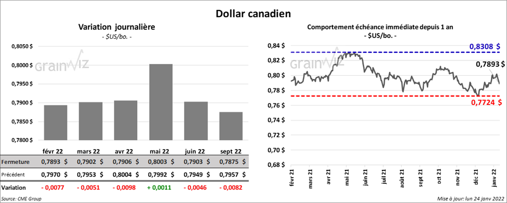 Les contrats de soya US aux échéances les plus rapprochées ont terminé la journée en baisse entre 11 ¼ et 13 ¼ cents. Ceux de tourteau de soya US ont fait l’inverse en fermant en hausse entre 60 cents et 1,20 $/tonne. Celui juillet 22 a fait exception en finissant en baisse de 10 cents. Les contrats d’huile de soya US aux échéances les plus rapprochées ont clôturé avec des pertes entre 103 et 105 points.