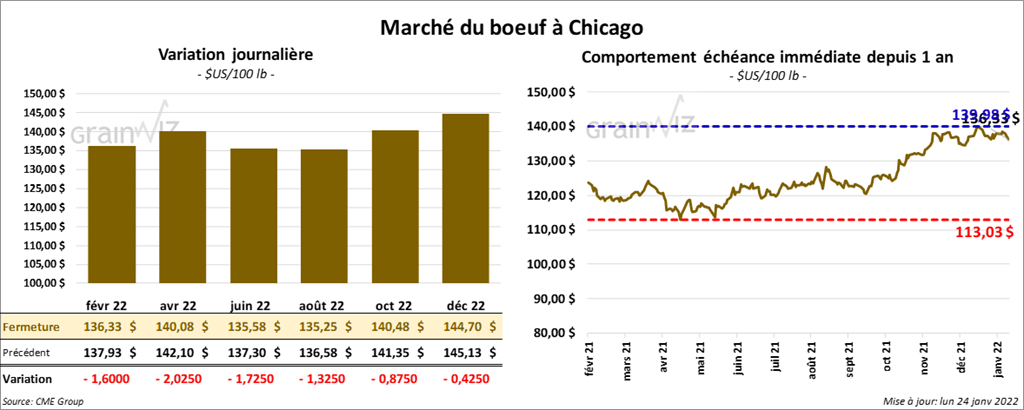 - Le 21 janvier dernier, le CME Feeder Cattle était en baisse de 64 cents à 160,46 $.