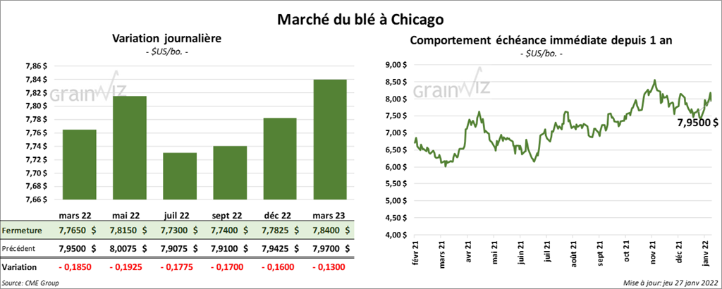 À Chicago, les contrats de blé aux échéances les plus rapprochées ont fini la séance en baisse entre 17 ¾ et 19 ¼ cents. À Kansas, ceux de blé dur rouge aux échéances les plus rapprochées ont terminé la journée en recul entre 20 ½ et 22 ¼ cents. À Minneapolis, les contrats de blé de printemps aux échéances les plus rapprochées ont clôturé avec des pertes entre 12 ¾ et 13 ½ cents.