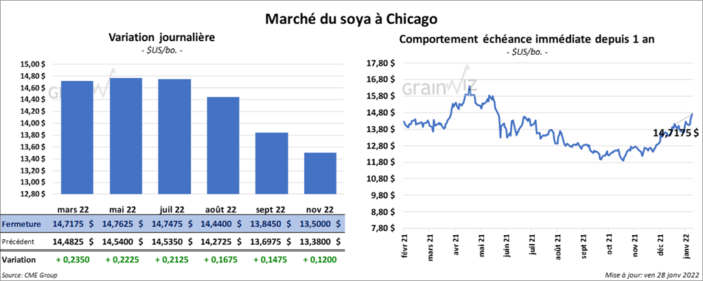 Les contrats de soya US aux échéances les plus rapprochées ont fini la journée en hausse entre 21 ¼ et 23 ½ cents. Ceux de tourteau de soya US aux échéances les plus rapprochées ont également clôturé dans le vert entre 6,40 et 6,70 $/tonne. Les contrats d’huile de soya US aux échéances les plus rapprochées ont fermé avec des gains entre 89 et 93 points.